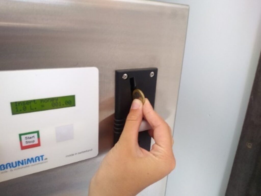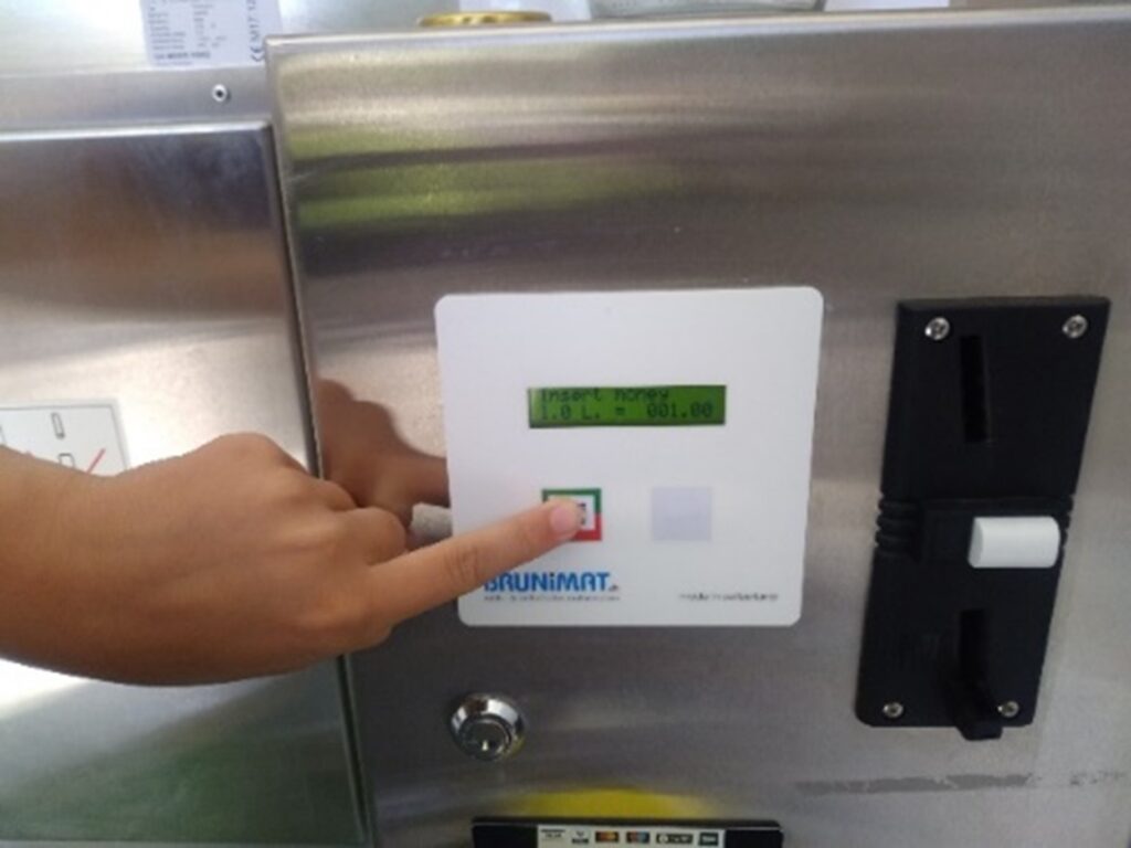 Per halve liter 1 druk op de knop, voor een liter dus 2 keer drukken, (maximaal 5 liter per keer)